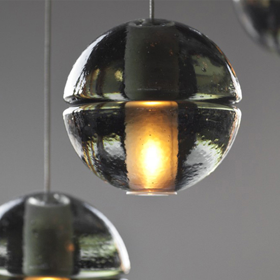 This low voltage pendant is designed to be clustered. Each individual pendant is an articulated cast glass sphere with a frosted cylindrical void that houses either a 10 watt xenon or 1.5 watt LED lamp.