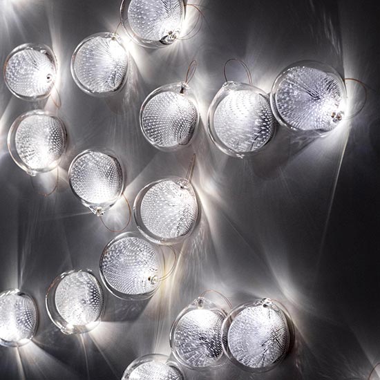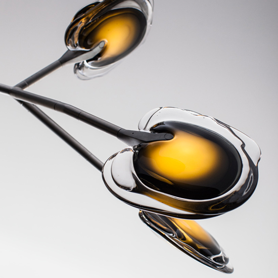 A bead blasted steel armature system connects the glass pieces to a series of branches and stems. Each armature segment carries low-voltage electricity and diverges into 2-4 separate branches, allowing an infinite variety of possible forms.