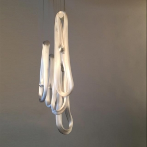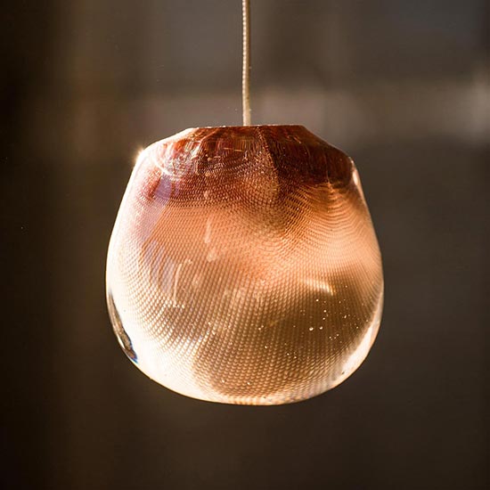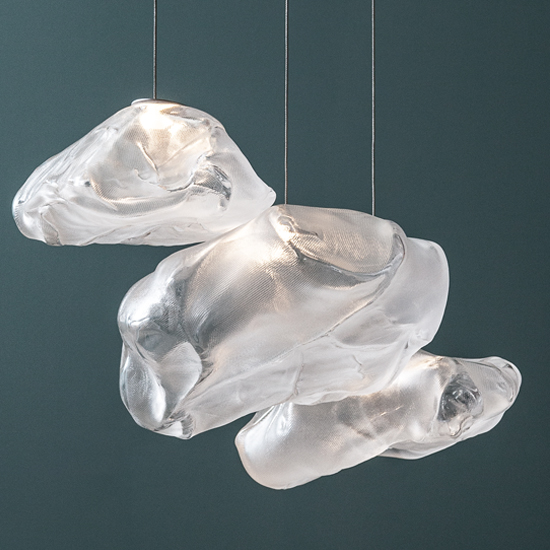 73 results from blowing liquid glass into a folded and highly heat-resistant ceramic fabric vessel. The resulting shape has a formal and textural expression intuitively associated with fabric, which becomes permanent and rigid as it cools. A flat LED is positioned to fill the resulting volume with diffuse light, accentuating the volumetric perception of the piece.
